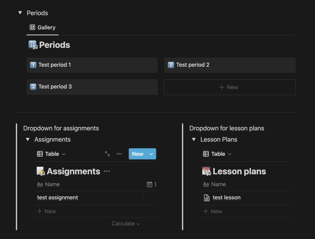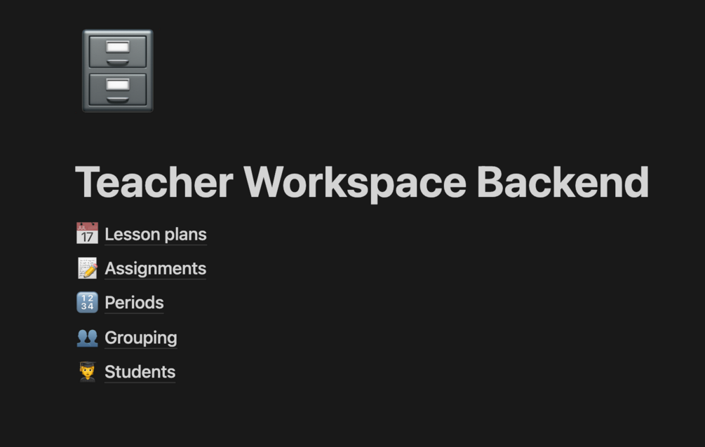 This is a Notion template that has databases for lesson plans, assignments, students, classes, as well as an optional subgrouping for each class